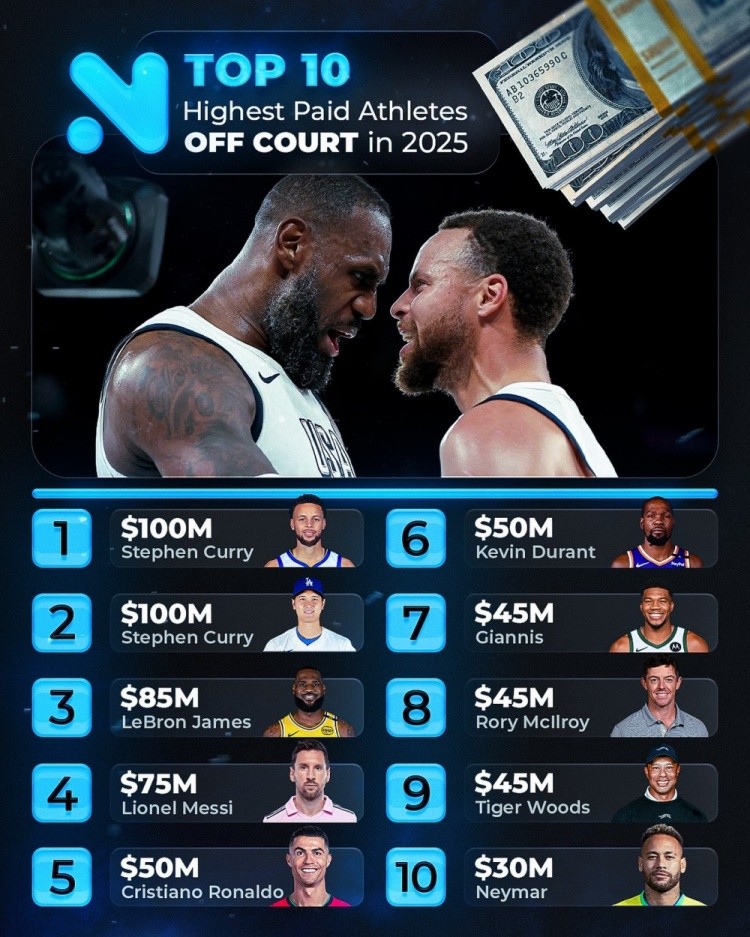 9月23日讯 美媒统计了2025年运动员场外收入前十的运动员榜单,其中库里以1亿美元居首!
